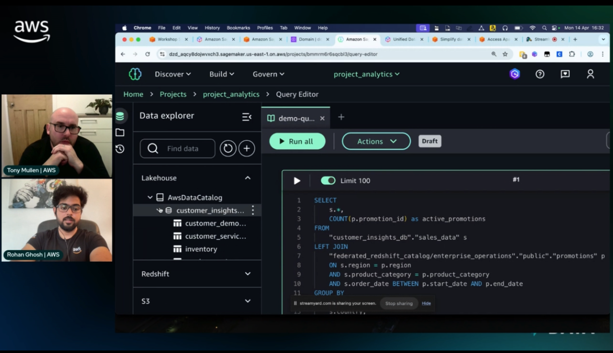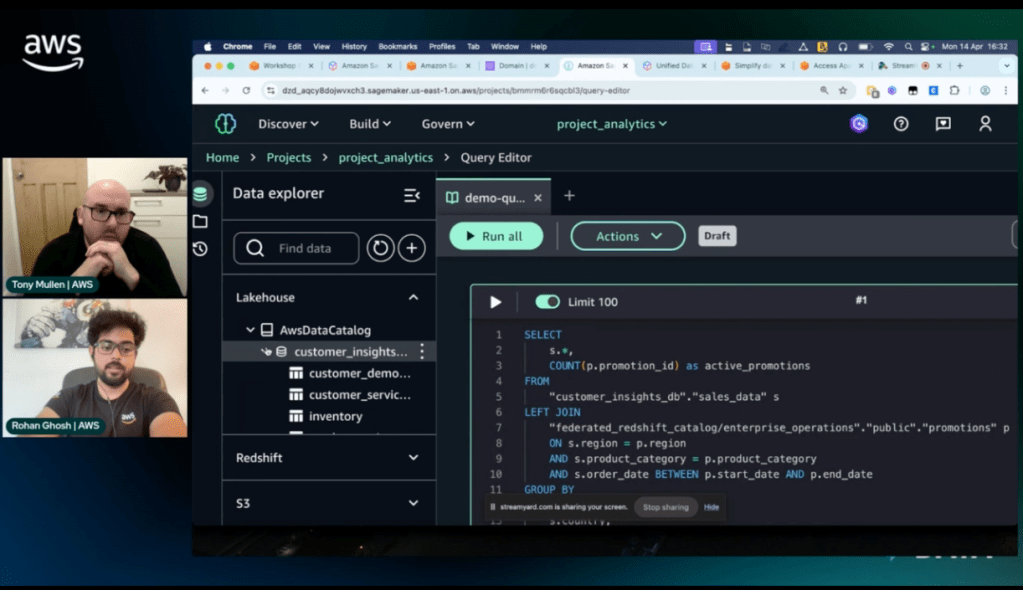 I recently hosted a show on twitch around Getting Started with Amazon SageMaker Lakehouse we had the superb Rohan Gnosh on as a Guest. The episode focused on Amazon SageMaker Lakehouse, a new offering within the next generation of SageMaker that aims to unify data access across an organization’s data estate. Rohan, explained how SageMaker Lakehouse breaks down data silos by providing a single interface to query and analyze data from various sources like S3 data lakes, Redshift data warehouses, and other databases. He demonstrated how the Unified Studio interface allows data teams and ML teams to collaborate more efficiently by sharing data assets through projects.