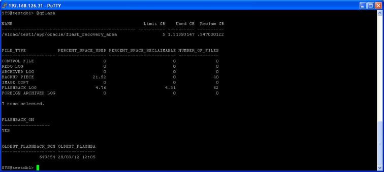 The qflash script will show the space allocated and used in the flash recovery, it will also listed whether flashback is turned on and the oldest time the database can be flashed back to.